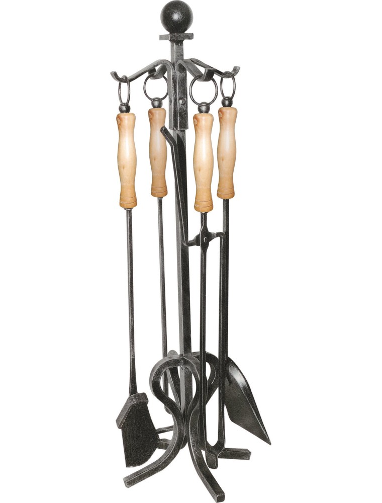 Kovaná čtyřdílná krbová souprava v kombinaci lopatka, smetáček, kleště a pohrabáč. Stojan pro nářadí a konce nářadí jsou ozdobeny mosaznými koncovkami. Výška: 70 cm Materiál: železo
